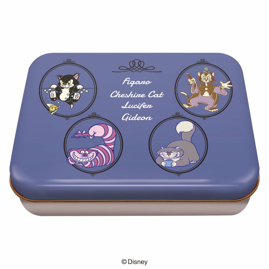 アリスのチェシャ猫、シンデレラのルシファー、そしてピノキオのフィガロ&クレオ、ギデオンがデザインされた「チョコギフト缶/ディズニーキャッツ」