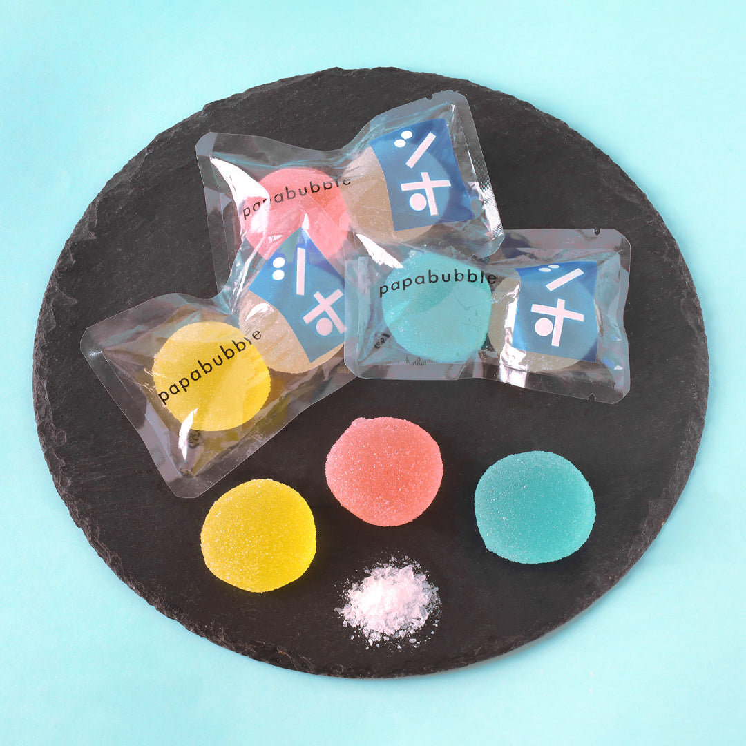 「塩バブレッツ」は各360円(税込)で、PAPABUBBLE 公式オンラインストアでは3種が1袋ずつセットになった「塩バブレッツセット」が1,080円(税込)で販売されています。