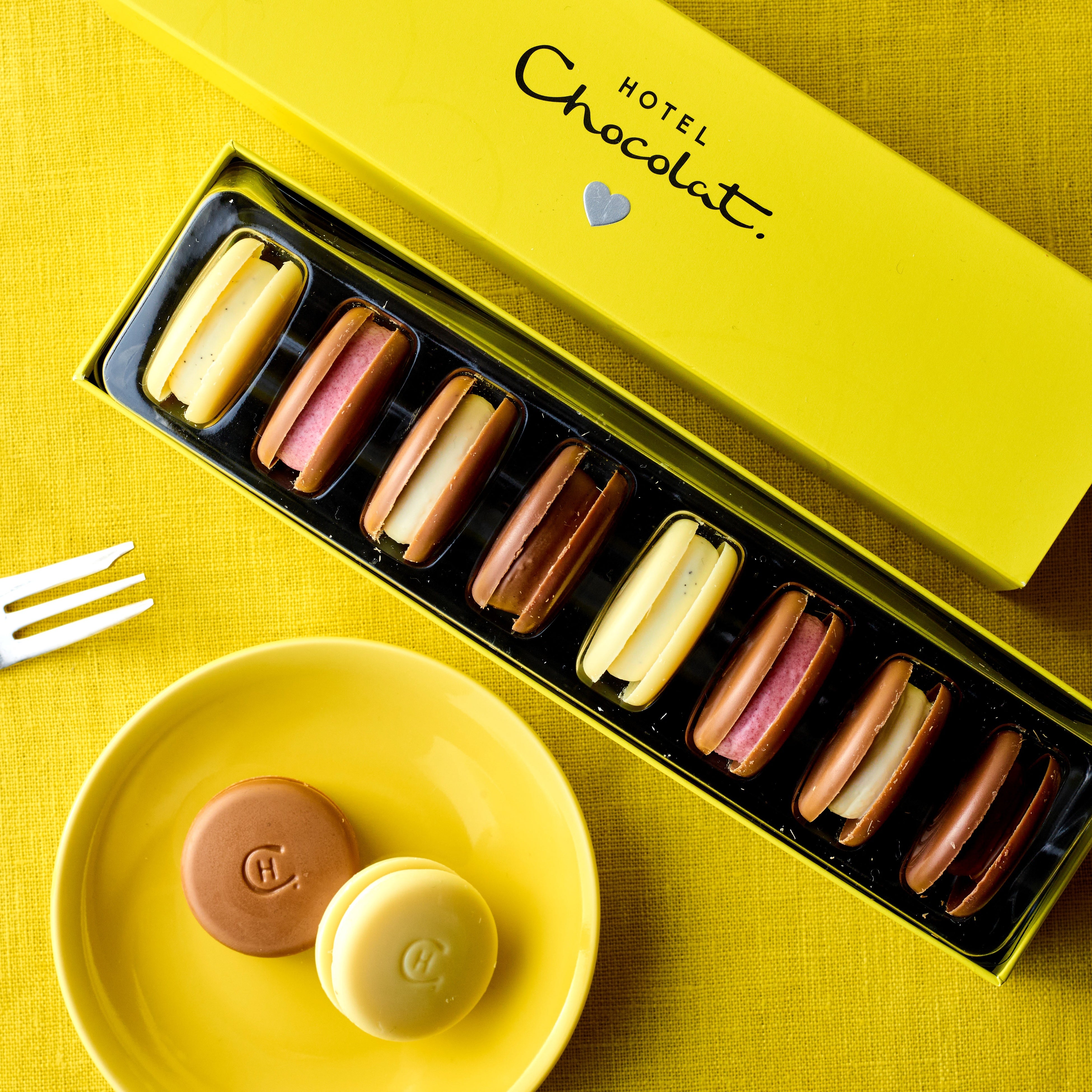 2枚のチョコレートでなめらかなホイップをサンドした、マカロン型のチョコレート。