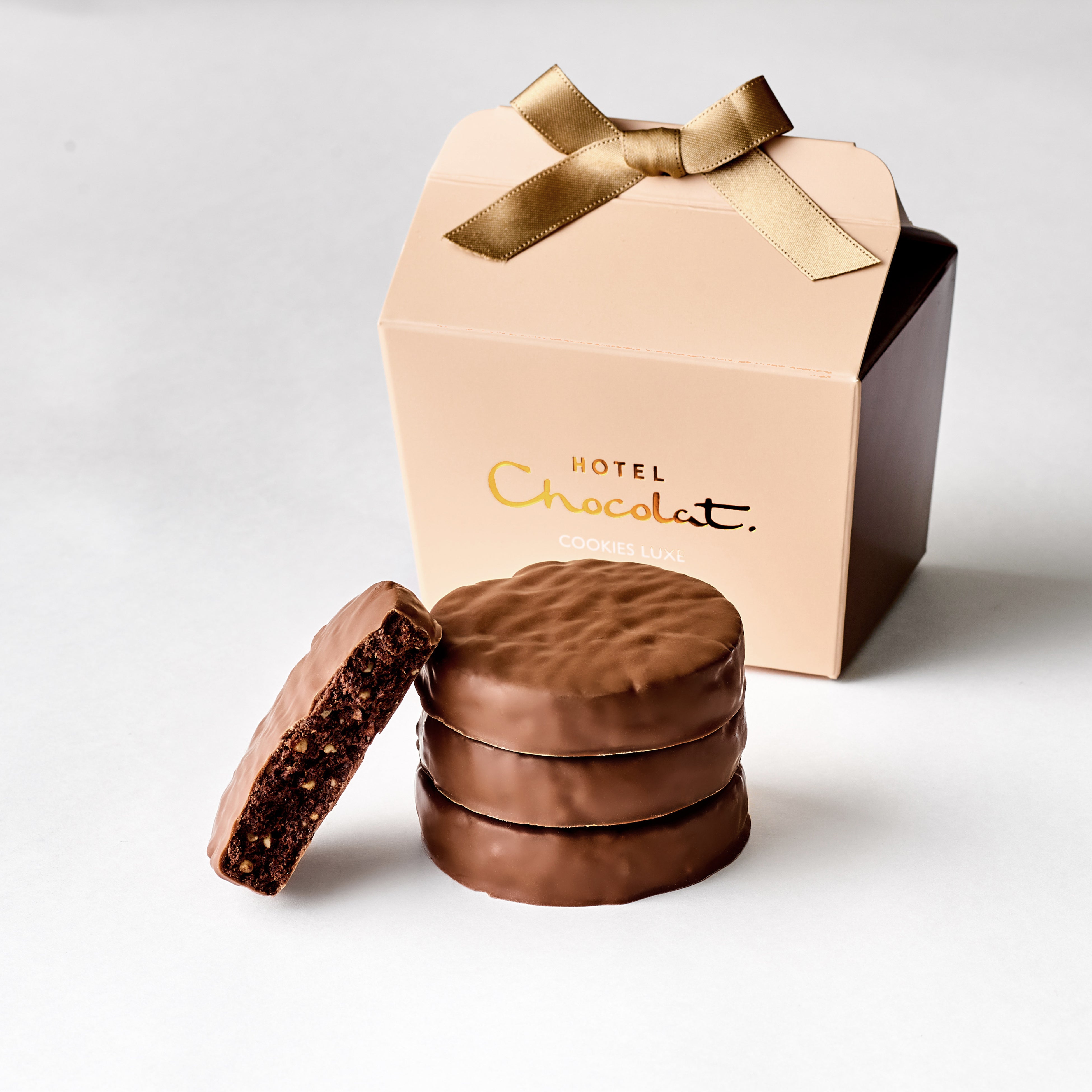 ダークチョコレートとココアを練り込んだクッキーを、3種類のチョコレートをブレンドしたミルクチョコレートでコーティングしたクッキーです。