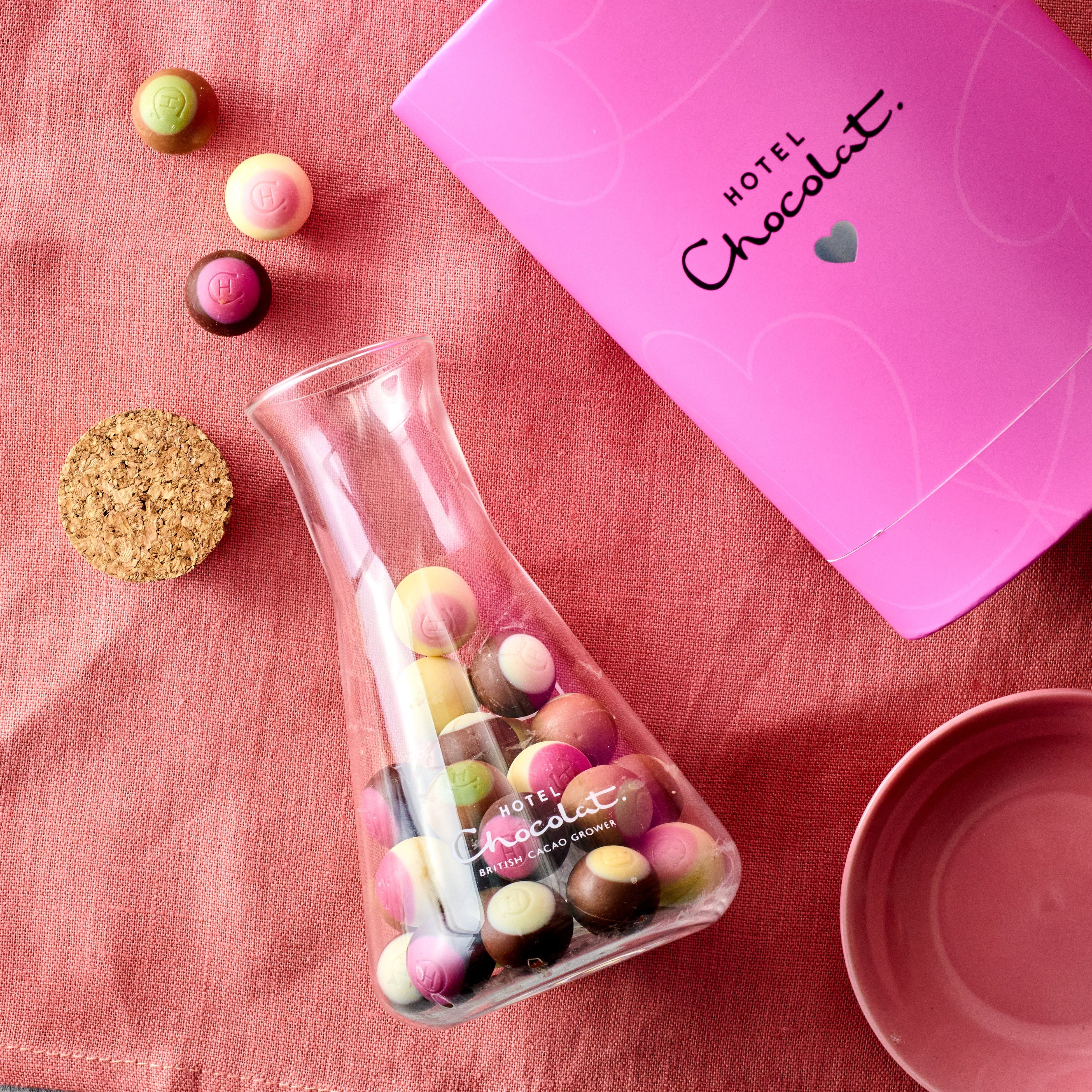 オシャレなガラス製のフラスコにカラフルな36個のチョコレートが詰まっています。